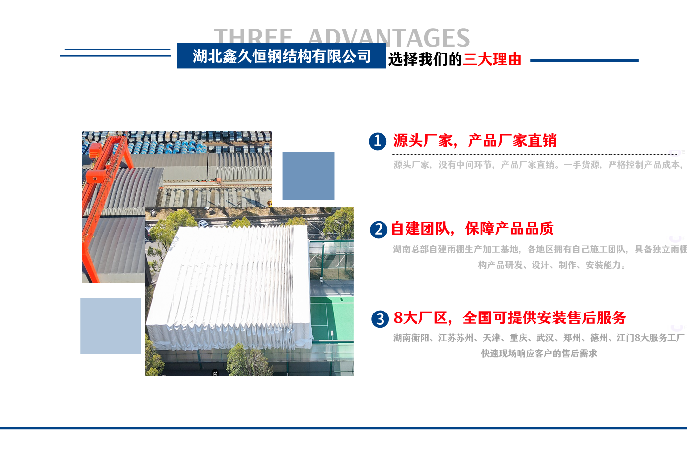 湖北鑫久恒鋼結(jié)構(gòu)有限公司是一家電動(dòng)雨棚、膜結(jié)構(gòu)車棚研發(fā),生產(chǎn)銷售,施工安裝于一體的專業(yè)鋼結(jié)構(gòu)科技公司,主要產(chǎn)品有伸縮雨棚,電動(dòng)雨棚,膜結(jié)構(gòu)車棚等?! 『系貐^(qū)職員目前有80多人,占地面積20000平方米,廠房面積15600平方米,配備先進(jìn)的生產(chǎn)流水線,使每件品質(zhì)產(chǎn)品的堅(jiān)實(shí)基礎(chǔ)?! 」驹谔K州、天津、重慶、武漢、德州、烏魯木齊、江門均設(shè)有服務(wù)工廠,總?cè)藛T共300多人,擁有專業(yè)的技術(shù)團(tuán)隊(duì),配備先進(jìn)的設(shè)備和流水線生產(chǎn),產(chǎn)能高,貨源充足,發(fā)貨速度快,服務(wù)區(qū)域廣?! ∫苿?dòng)伸縮棚適用于通道臨時(shí)倉(cāng)儲(chǔ)、戶外運(yùn)動(dòng)遮陽(yáng)、污水池遮蓋、能源交通、熱力化工、礦山、船舶制造及市政建設(shè)、物流、碼頭等領(lǐng)域的構(gòu)件制作加工,成品半成品存放、倉(cāng)庫(kù)、野外儀器設(shè)備操作用房等。尤其是對(duì)工廠發(fā)貨、倉(cāng)儲(chǔ)臨時(shí)遮雨防嗮,梅雨期較長(zhǎng)、建設(shè)周期較短的工程施工等特別適用。還可根據(jù)用戶需求量身定制、適合企業(yè)所需不同款式的產(chǎn)品?! ∥夜緢?jiān)持“誠(chéng)信社會(huì)為本,客戶滿意為榮”的經(jīng)營(yíng)理念,做到質(zhì)量把控,嚴(yán)格管理,精益求精,恪守承諾。使鑫久恒逐步走向成熟,其系統(tǒng)化、專業(yè)化日趨完善。以專業(yè)的技術(shù)、科學(xué)的管理,更高的產(chǎn)品質(zhì)量,優(yōu)良的企業(yè)信譽(yù),真誠(chéng)的客戶服務(wù),靈活多樣的經(jīng)營(yíng)方式和務(wù)實(shí)創(chuàng)新的企業(yè)精神愿與社會(huì)各界攜手合作,為推動(dòng)智能鋼結(jié)構(gòu)建筑事業(yè)的發(fā)展而不斷努力。...